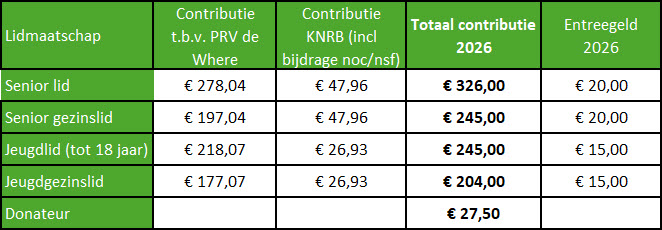 Je betaalt de contributie vooruit per kalenderjaar. De bedragen zijn inclusief de KNRB-bondscontributie en de bijdrage aan de gemeente Purmerend. Bij tussentijds aanmelden berekenen we de Where-contributie per maand. De KNRB-contributie en de bijdrage NOC/NSF zijn altijd een volledig jaarbedrag. Voor 2026 is dit voor volwassenen € 47,96 en jeugd € 26,93. Het entreegeld is een eenmalige bijdrage in de kosten van aanschaf en onderhoud van de boten.