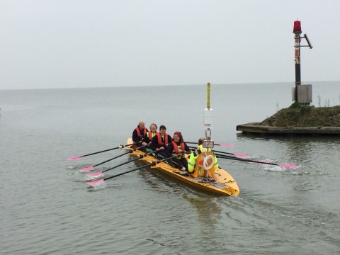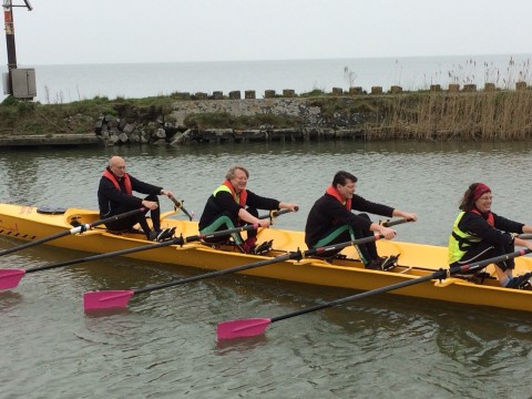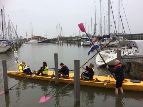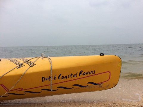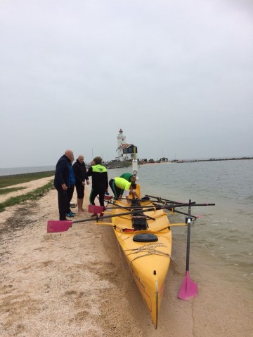 Na zo'n halfuur moeten we ergens naar stuurboord. Paulien en ik wisselen (eitje in zo'n boot en op dit water). Ergens in de grijze verte moet Het Paard staan. Bij zonnig weer zie je Het Paard ook pas als je in de buurt komt. Het voetenbord stel ik op mijn lengte en dat is meteen de laatste stelstand. Het blokje is BB iets verdraaid en vergeet het maar dat die nog loskomt. Geeft niet doorroeien bekijken we aan wal. Mooie boot lekker roeien, maar zo als ik nu zit zie je nog steeds niks. Water en lucht en geen idee of en hoe snel je vooruitgaat. Heel grappig de wereld is gewoon even weg. De koers uitzetting blijkt te kloppen en na een halfuur of iets mee kunnen we om Het Paard van Marken heen. Aanleggen aan de zuidelijke kant, daar loopt het strand geleidelijker op. Als we aan wal staan arriveert de walploeg op de fiets. Iets te lang ons na staan te zwaaien. Vanuit Edam is het 20 km naar Het Paard, wij hebben maar 13 km geroeid. Hans en Paulien (M.W.C.) hebben Limburgse Vlaai meegenomen en die is toch heel wat lekkerder dan die van de Multivlaai. Of komt het omdat we een lekker stukje hebben geroeid? In de Noorderhaaks blijkt ook een waterpomptang te liggen (handig zo'n gereedschapskist) blokje recht draaien en het is weer in orde. Niet te langkletsen brood op, drinken op en er kan weer een ploeg het water op.