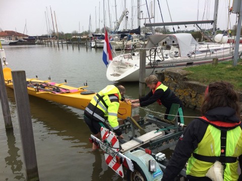 De Noorderhaaks erin. Mooie trailerhelling in Edam, maar wie zet nu al de afmeerpalen hier neer? Rustig te water laten en dan over de boeg naar achteren. Lekker breien met de riemen om de meerpalen. Insteken en aflaten glijden.