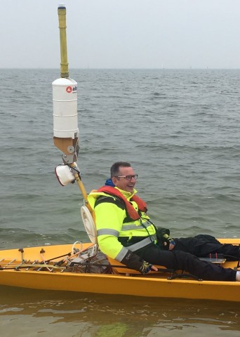 Echt wel leuk, normaal varen we langs de kust en gaat de oriëntatie op wat je aan de wal ziet. Vandaag effe anders, de lucht en het water zijn even grijs en zelfs de zon is niet te zien. Kompas tussen je voeten en dan proberen die 90 graden aan te houden. In de verte gaan zeilboten naar de horizon (tenminste dat hoop je dan maar). Een groot grijs niks om je heen snelheid schatten, koers volgen. Hoe verder uit de kust hoe meer golfslag. Ook al stelt het niks voor in verhouding tot een leuke branding op de Noordzee. We kunnen mooi even wennen aan die 100 kg Noorderhaaks en het feit dat het water aan de boorden niet altijd even hoog is.. Dat gele gevaarte loopt wel lekker als je je best doet.