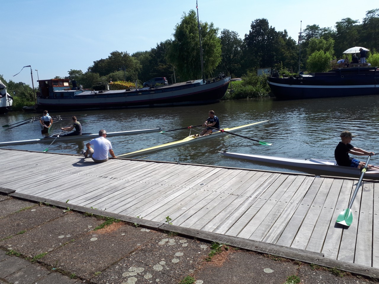 Hans: 'Roeien is een fijne sport om vele spieren in je lichaam te trainen. Of het nu gaat om een toertocht of een wedstrijd je bent lekker bezig in de natuur. Mensen enthousiasmeren voor de roeisport is fantastisch om te doen evenals het lesgeven. Zeker als je bedenkt dat de twee sporten zo veel verschillen. De schermers waren van alle leeftijden van 10 tot 60 jaar. Instructeurs van de Where hebben de schermers in Wherry's gezet, veilige-brede- meer persoons boten en voor de nog sportievere was er een les in de skiff, een één-persoons snelle instabielere roeiboot. Zelfs de kleine schermertjes, onder de bezielende leiding van enkele jeugdige instructeurs, konden kennismaken met de jeugd-skiff. Het weer was prachtig zodat vele scherm/roeiers een duik in de Where namen. Na afronding van het roeien werden de Where-leden bekend gemaakt met de schermsport. Hele andere spieren en wat een concentratie is hierbij nodig. Na afloop wat water en een frisje en de middag smaakt naar meer.